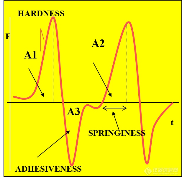 硬度:牙齿间用来压迫样品所需要的力,定义为获得一定的形变所必须的力。硬度值是一次压缩时的峰值,多数食品的硬度值出现在变形处,有些食品压缩到变形处并不出现应力峰。其反义词为软度。
