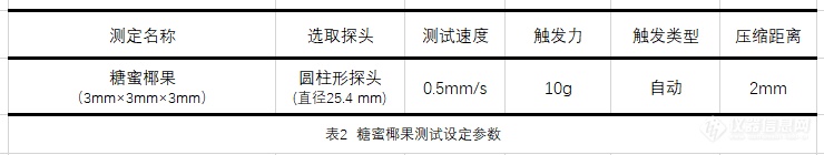 取适量糖蜜椰果厚薄均匀的平铺在不锈钢平皿中,通过ta软件设定相应的参数进行测定。实验程序在tpa模式下,触发力为10g,测试速度0.5mm/s,压缩距离为2mm。由测试结果得到各个参数值及试验曲线,每个样品重复做15次,去掉一个高值和一个低值后取平均值。具体测定参数如表2所示。